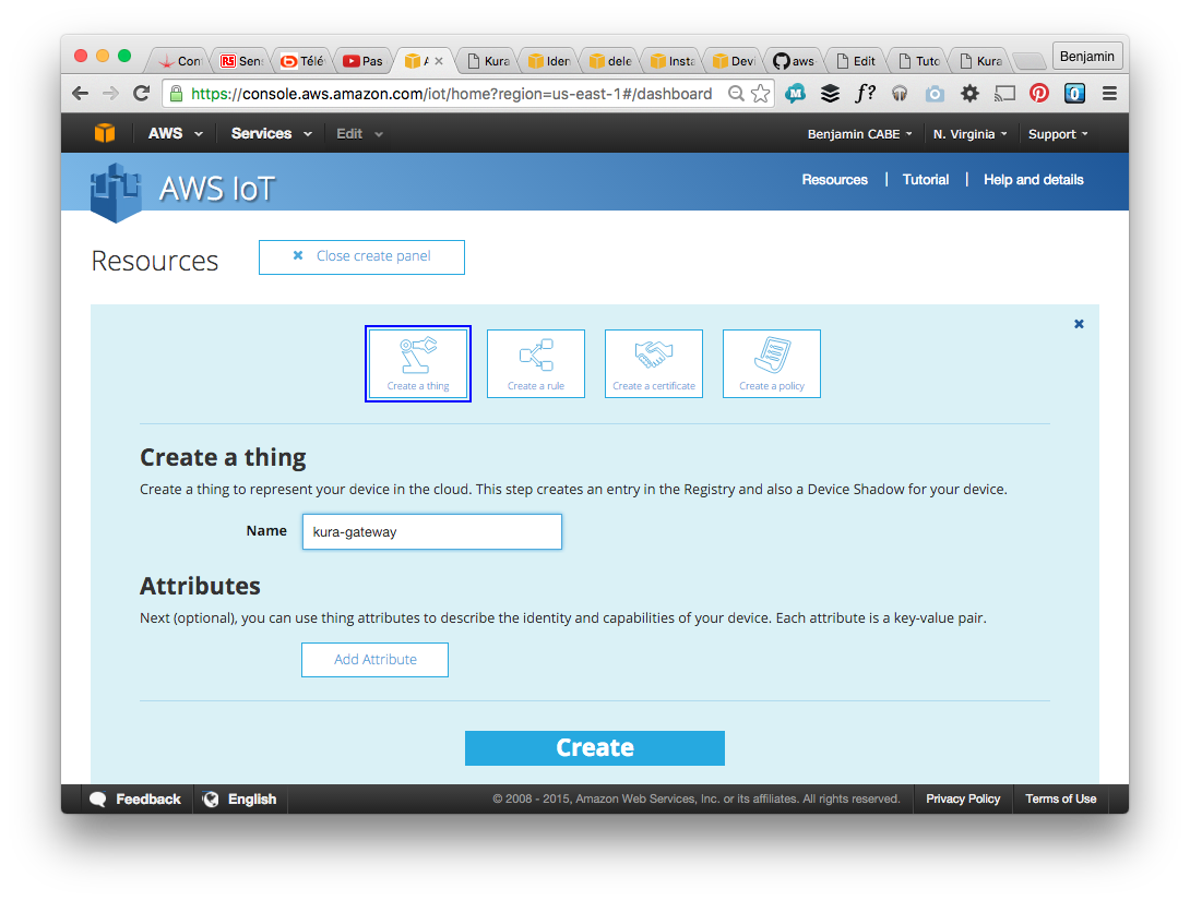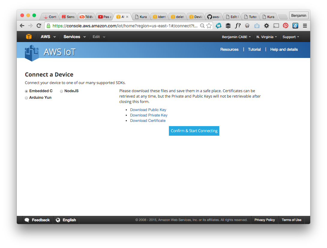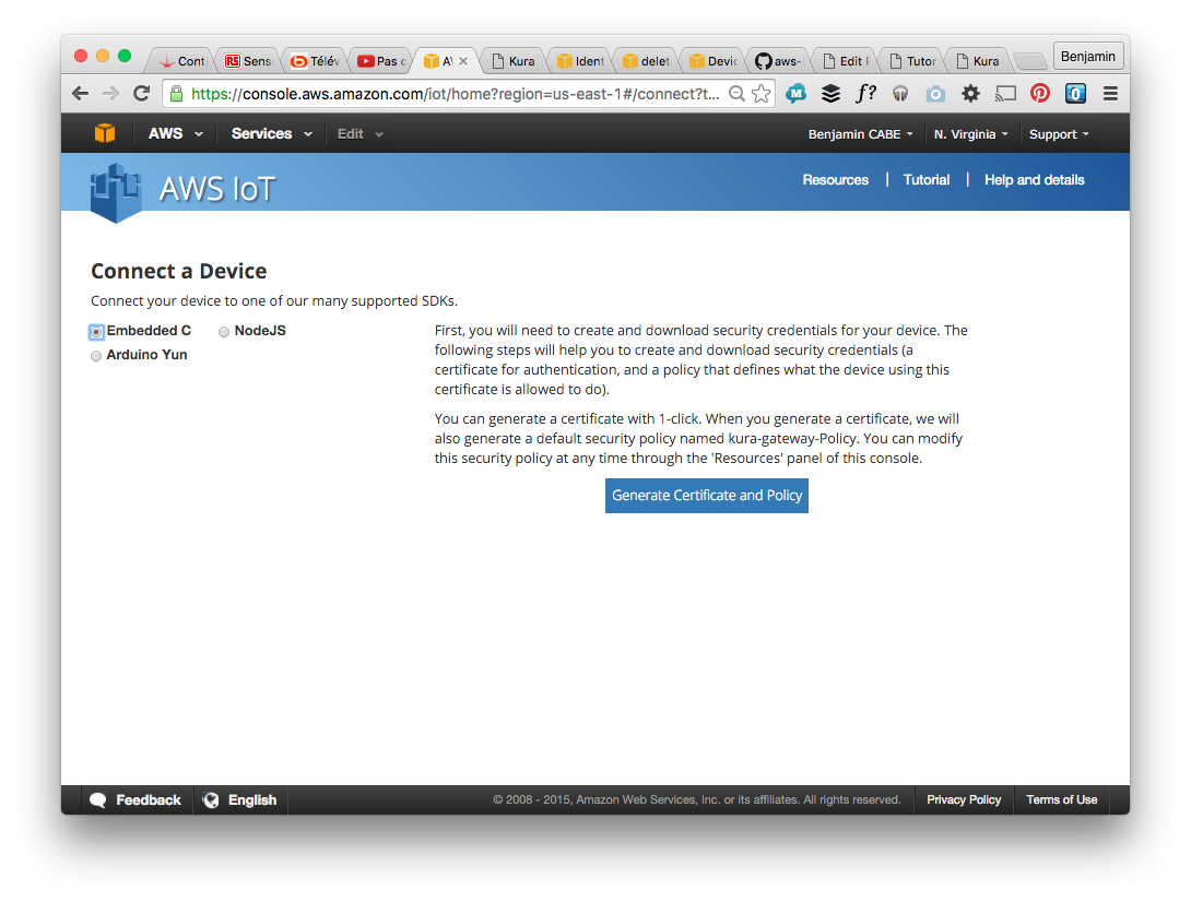 So you need to create a “Thing”, with an attached certificate and policy to allow it to communicate. The easiest way to go through this is to create the thing from the web console, and then use the “connect wizard” to connect it. See the screenshots below, this should be pretty straightforward